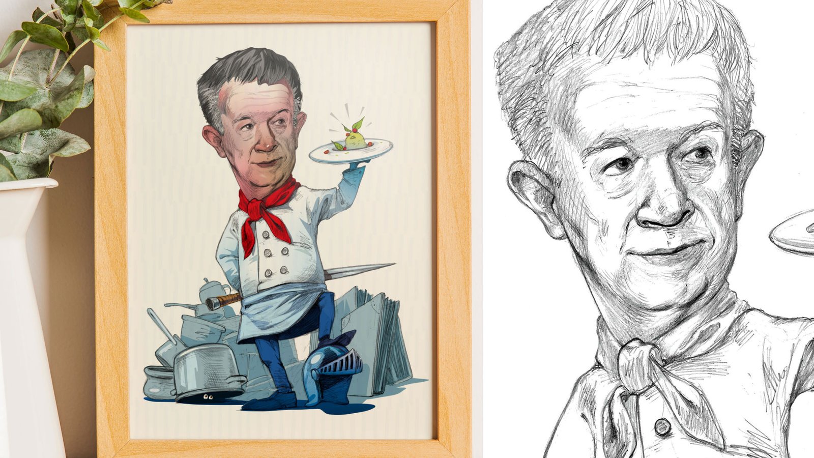 Realization: Birthday gift for a colleague, chef enthusiast. The project combines pencil drawing with coloring through graphic software.