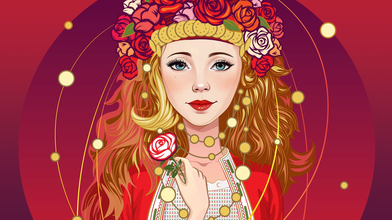 Realization: A portrait of a girl in a folk costume is in a vector style with predominant warm, red shades.
