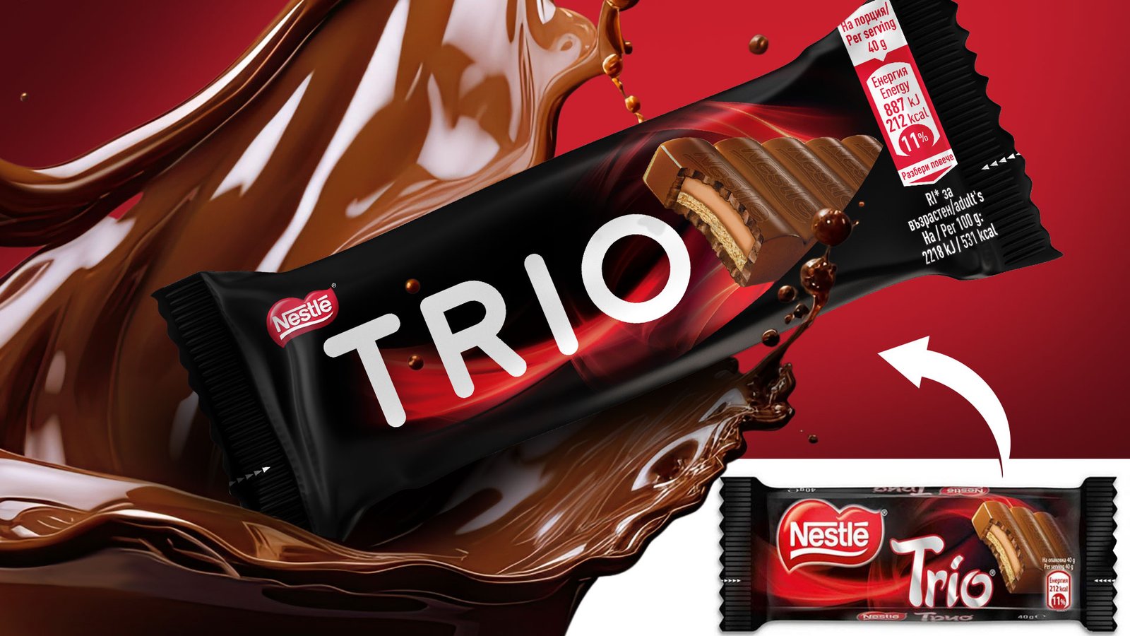 Realization of the project: Given the increase in many of the elements, the manufacturer's logo had to be drastically reduced at the expense of the product name. I made the inscription clean and easily readable, which was contributed by the additional distance between the letters. I retouched the visualization of the chocolate bar to take up more space. I reduced the background activity in certain places and merged it visually with the product through an ascending rounded shape, which contributed to the clearer graphic rhythm in the package.