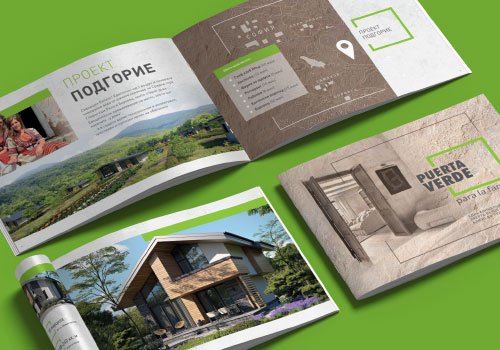 Design work: I chose a landscape format for the catalog to correspond with the panoramic nature photos in which the architecture fits. As the main colors I chose beige, gray and light brown tones, as well as textures of natural materials such as stone, limestone, marble, wood, etc. For an accent, I used the fresh, bright green of the logo.