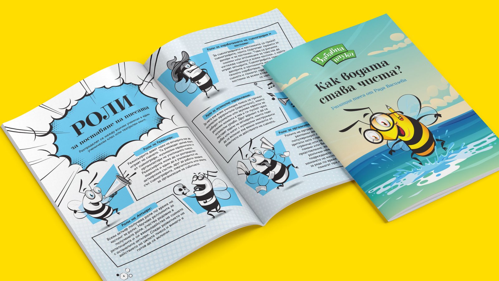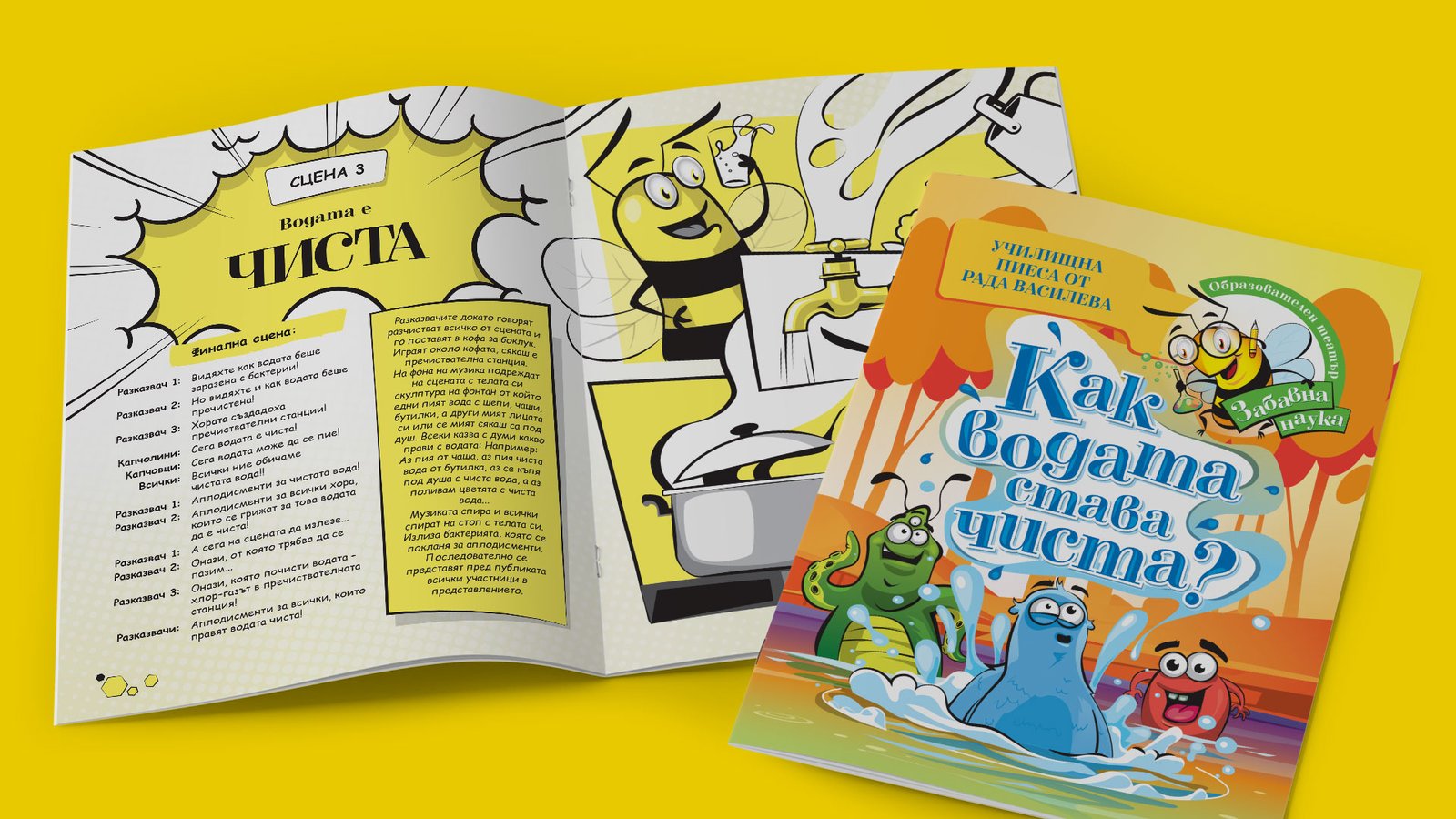 Design work: I started work on this project having a predefined release format. The technical limitations were that unlike the cover, which is full color, the body of the book had to be printed in only two colors. Given the children's audience for which the script is intended, I made the design in a comic book style. I used the style of the character from the client's logo as a starting point when creating the rest of the illustrations in the booklet.