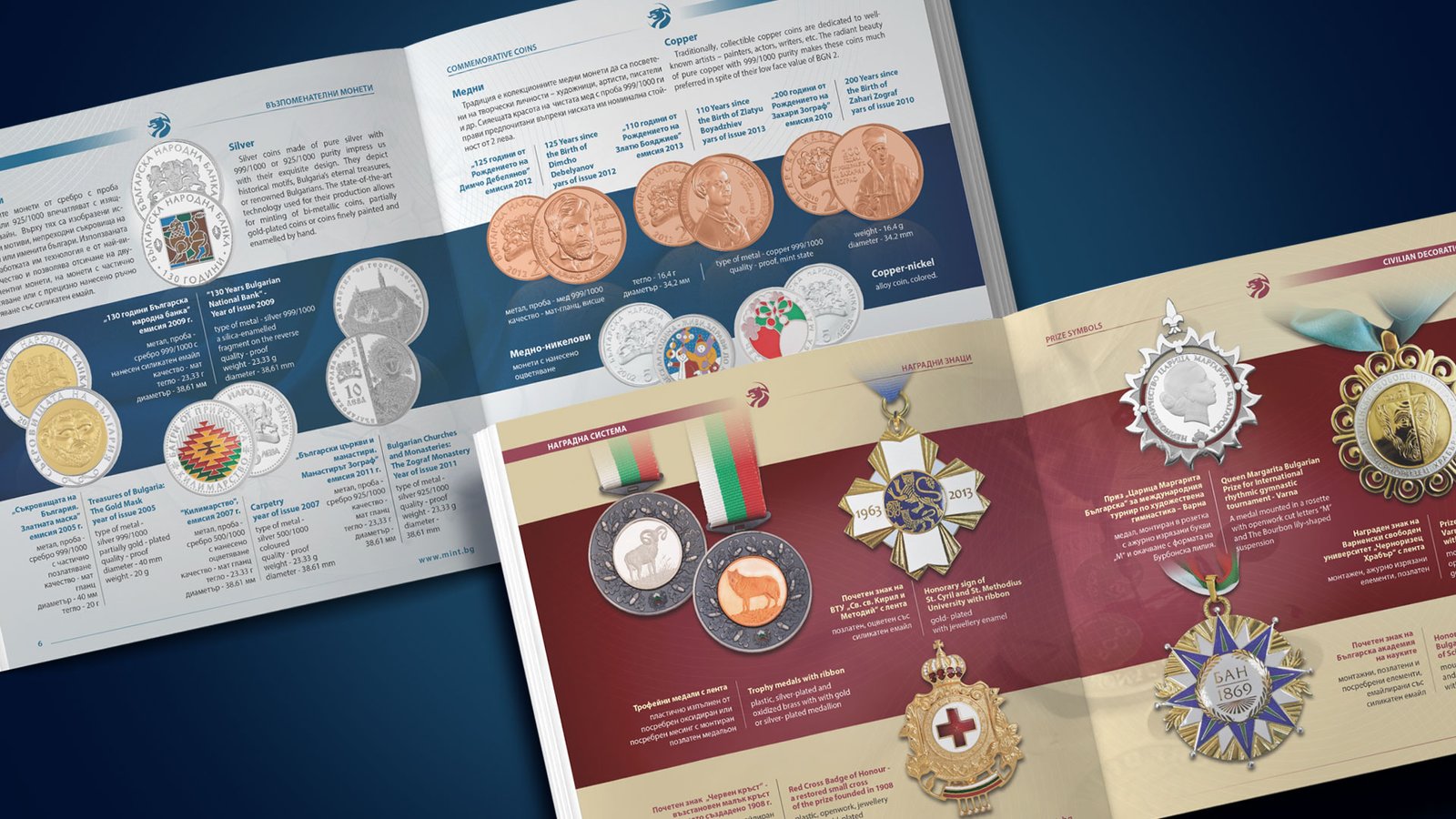 Design work: I started the project by photographing most of the products, color processing and photo retouching. The challenge at this stage was to adjust the light and set up the technique to capture even the smallest details on the coins, medals and other products. In the subsequent color processing of the images, I had to make sure that the various metals and surfaces were correctly reproduced. For the cover I created an abstract, image design using the emblem of the Bulgarian Mint. The design of the internal pages focuses on the products, with each section being distinguished by its own color scheme.
