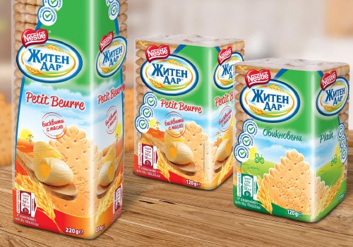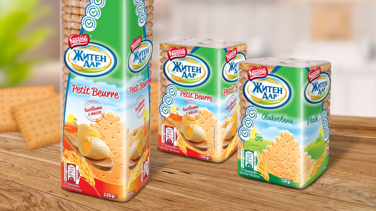 Task: Two types of biscuit packaging design. Three "stamps" and the new product look must be included.