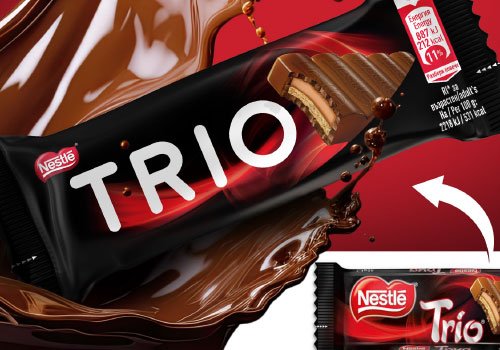 Realization of the project: Given the increase in many of the elements, the manufacturer's logo had to be drastically reduced at the expense of the product name. I made the inscription clean and easily readable, which was contributed by the additional distance between the letters. I retouched the visualization of the chocolate bar to take up more space. I reduced the background activity in certain places and merged it visually with the product through an ascending rounded shape, which contributed to the clearer graphic rhythm in the package.