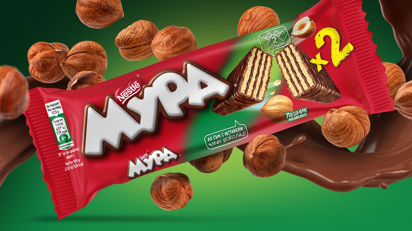 Task: Design of wafer packaging with dark chocolate and hazelnut flavors from the Mura series.